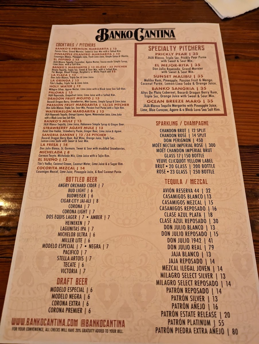 Banko Cantina's menu shines with a diverse selection of drinks and delectable dishes, perfect for any occasion. Sip on the refreshing Don Julio Margaritas or delight in bottomless mimosas during their famous Sunday brunch. With generous options like the Ocean Blue Margarita Pitcher and tasty Banko Sangria, your taste buds are treated to a fiesta of flavors.
